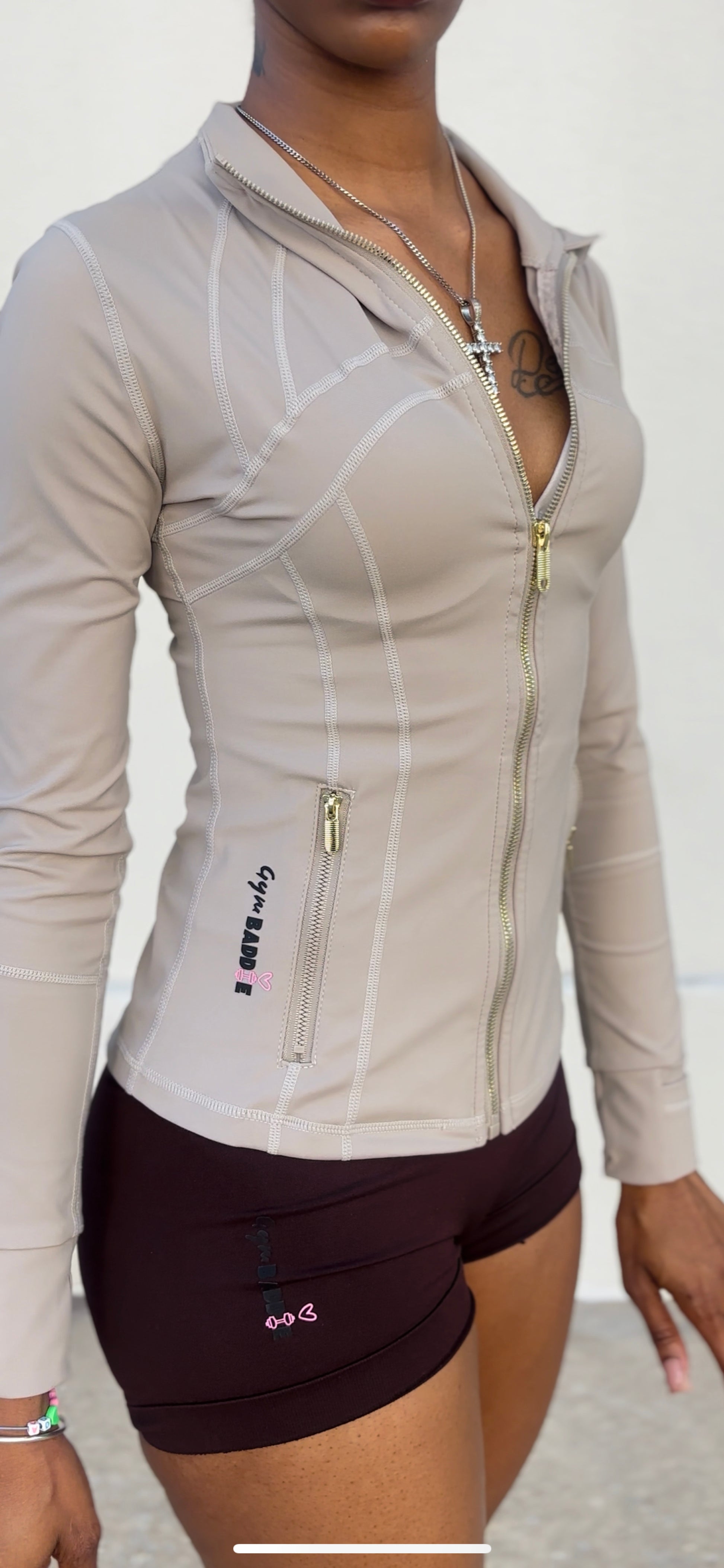 Elevate your gym game with our Bronze Baddie Jacket. Made with luxurious materials, this light brown jacket exudes confidence and style. The gold zipper adds a touch of sophistication, making this the perfect choice for any risk-taking baddie ready to conquer the gym in style!